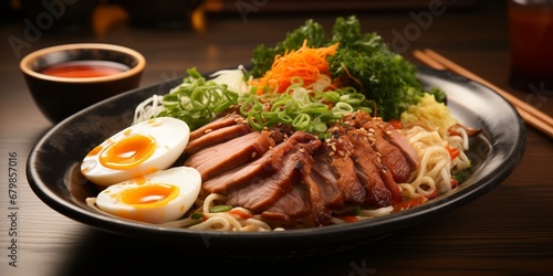 pork meat, noodle, egg, scallion, sesame seeds, kale, carrot, soy sauce, dish, plate, food, asian cuisine, cookery, meal, lunch, dinner, eatery, eat, dining, delicious, savoury, flavorful, healthy, side dish, garnish, fresh, cooked, serving, presentation, photo, image, picture, photo