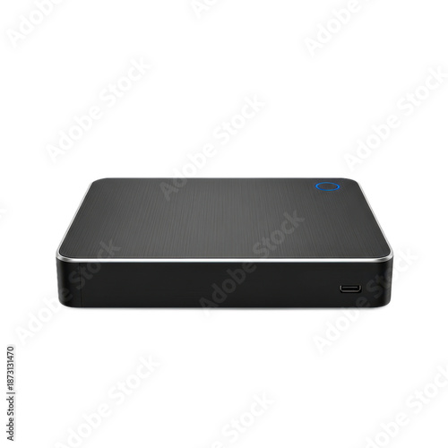 Portable external hard drive sleek black design with silver trim for data storage and backup isolated on white background