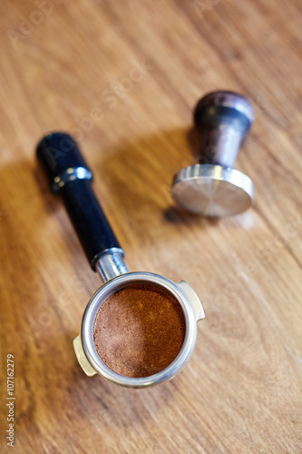 Portafilter on wood containing ground coffee and a tamper nearby