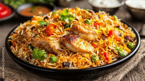 Portion of Chicken Biryani served with freshly chopped salad on the side, no background. --chaos 20 --ar 16:9 --quality 2 --v 6.1 Job ID: 5ae49345-3832-4713-9f94-23836f97019e