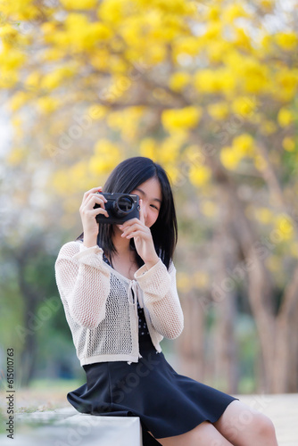 Portrait cute smiles Asian of attractive young teenage girl a holding the camera in blooming Yellow Golden Tabebuia Chrysotricha flowers with the park in spring day at Evening background in Thailand.