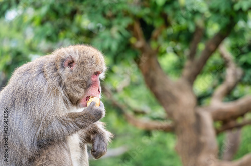 Portrait detail with Japanese macaque or snow monkey eating an apple in Arashiyama Park, Kyoto.