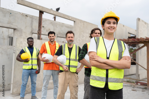 Portrait Hispanic Latin engineer woman with Multi-ethnic Team engineer or team labor at precast cement outdoor factory