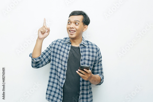 Portrait Indonesian Asian young man smiling while looking at smartphone and index finger pointing up. Isolated white background
