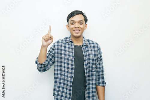 Portrait Indonesian Asian young man with index finger pointing up. Casual concept isolated white background
