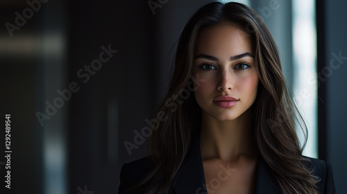 Portrait of a beautiful brunette woman in a black suit, with brown eyes and long hair, generative AI
