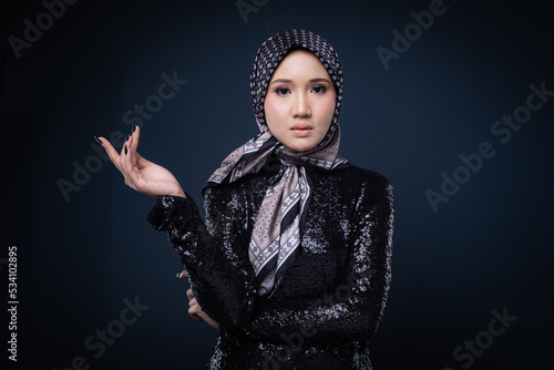 Portrait of a beautiful female model wearing hijab, a lifestyle apparel for Muslim women isolated on grey background. Idul Fitri and hijab fashion concept.
