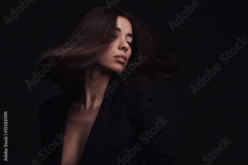 Portrait of a beautiful girl with flying brown hair over dark studio background