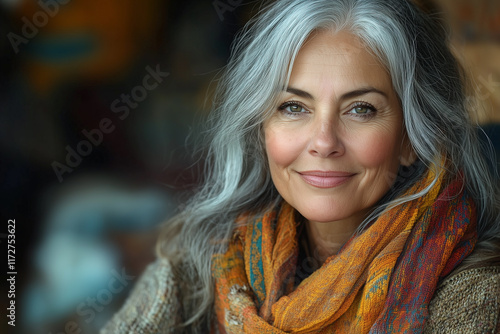 portrait of a beautiful gray-haired woman with a bright scarf