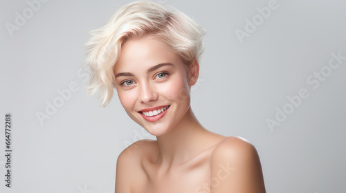 Portrait of a beautiful, sexy Caucasian woman with perfect skin and white short hair, on a white background.