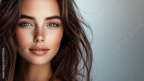 Portrait of a beautiful woman with brown hair and posing copy space for texts. Advertising concept of healthy lifestyle, self-care, dermatology and skincare