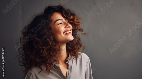 Portrait of a beautiful young woman with curly hair smiling and looking away, grey background, copy space