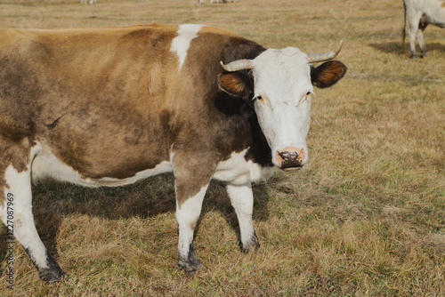 cow, farm, field, dairy, pasture, meadow, animal, graze, grass, farm animal, countryside, background, green, sunrise, panorama, horizon, morning, farmland, country, beef, sky, summer, concept, nature, landscape, agriculture, mammal, cow, rural scene, head, milk, face, happy, cute, curious, black-and-white, horizontal, adorable, silly, eating, feeding, animal themes, domestic animals, bull, brown