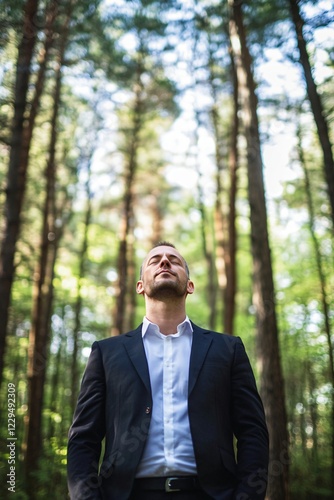 Portrait of a businessman in a suit standing outdoors in a serene forest, eyes closed, embracing a moment of tranquility and connection with nature