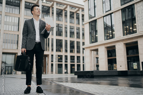 portrait of a businessman smart young man guy in a gray suit of Caucasian appearance, holding a laptop. gray business suit, stands near the business center. smile on your face