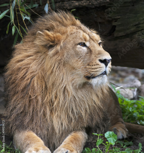 Portrait of a calm Asian lion, resting in shady forest. The King of beasts, biggest cat of the world. The most dangerous and mighty predator of the world. Square image.