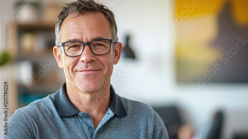 Portrait of a cheerful middle-aged man with glasses, wearing a polo shirt, standing in his home office, looking warmly into the camera