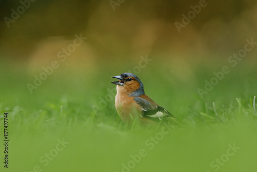 Portrait of a common chaffinch (Fringilla coelebs) male the grass, Belgium