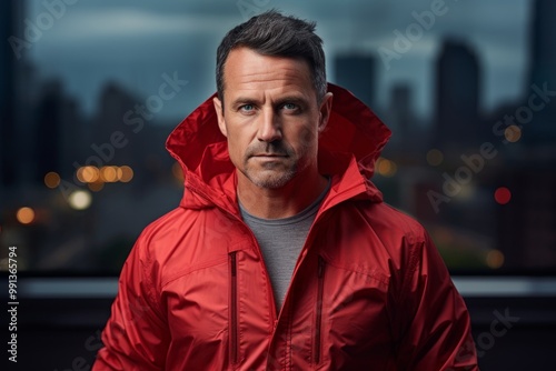 representation, portrait, illustration, expression, mood, content, 40s, adult, male, man, lightweight, hard-wearing, protective, outfit, zip, comfort, versatile, hood, functional, costume, polyester, trend, anorak, building, background, business, urban, architecture, modern, tower, street, landscape, office, downtown, sky, city landscape, city