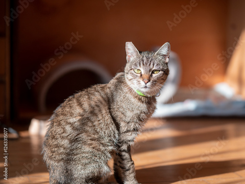 Portrait of a cute cat indoors during the day, a spotted cat sitting on the floor in an apartment
