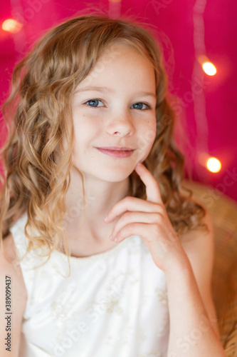 .Portrait of a cute girl on the background of Christmas garlands