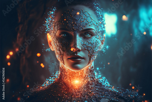 Portrait of a female cyborg robot. Concept for Artififial Intelligence. Designed using Generative A