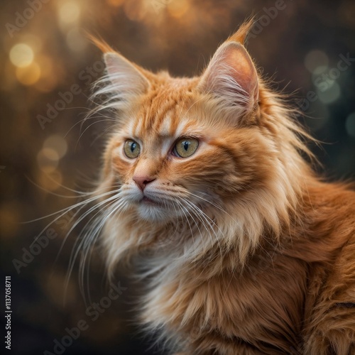 Portrait of a Fluffy Orange Cat with Golden Eyes and Soft Fur Against a Warm, Bokeh Background