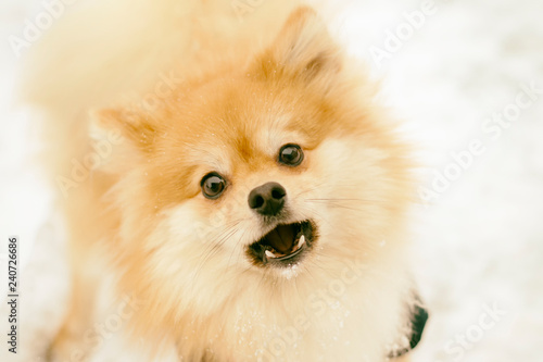 Portrait of a ginger Pomeranian dog on a background of snowy winter. have toning.