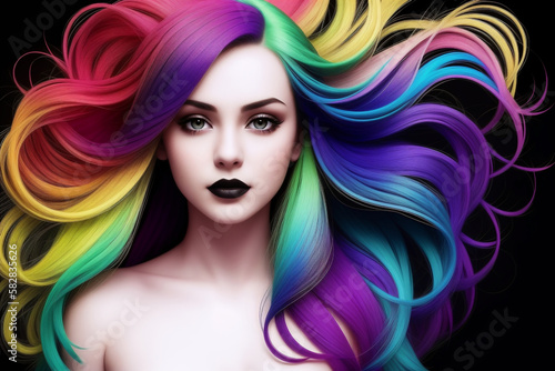 Portrait of a girl with developing bright multicolored long hair and bright makeup. AI generative