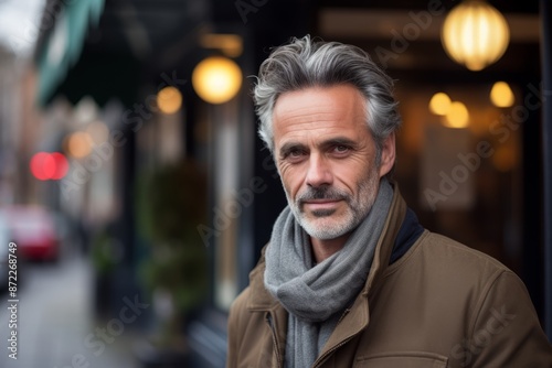 Portrait of a handsome middle-aged man in a coat and scarf on a city street.