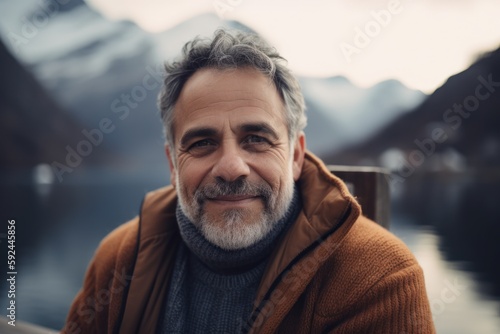 Portrait of a handsome middle-aged man with gray hair and beard in a warm sweater on the background of mountains.