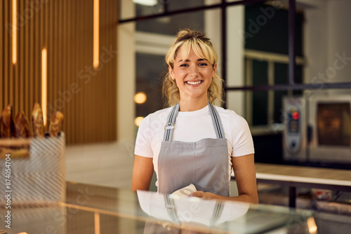 Portrait of a happy blonde girl, wearing an apron, working at the bakery shop.