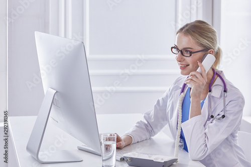 call, female, medicals, center, doctor, health, care, clinic, medicine, phone, phone, headset, adviser, diagnosis, health care, people, person, medic, clinical, consulting, exam, happy, laboratory, prescription, specialist, talk, laboratory, cheerful, exam, success, woman, men at work, background, smiling, speaking, white, work, indoor, office, 1, blank, grey, grey, hospital, woman, area, copy space, text