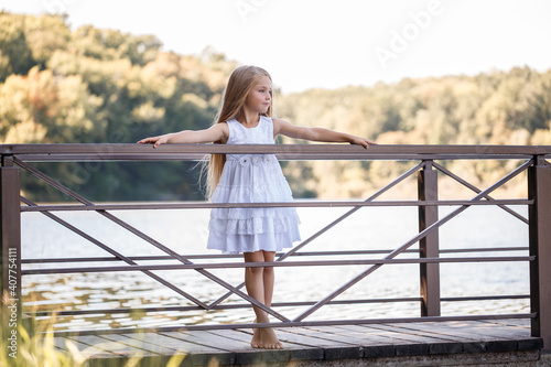 Portrait of a little girl outdoors in the summer by the lake. Little girl in summer dress by the river.