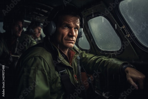 Portrait of a male pilot in the cabin of a helicopter.