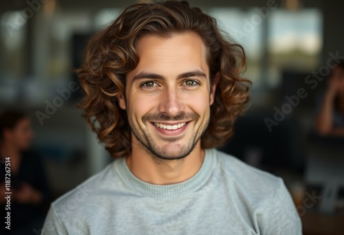 negative, gaze, human, direct, emotional, man, people, long, background, expression, blurred, sharpened, space, insertion, smile, hair, curly, brown, portrait, warm