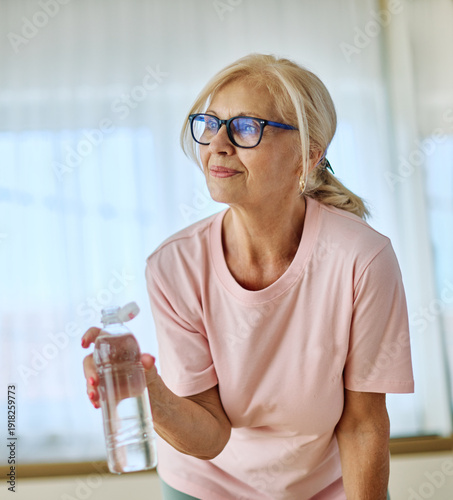sport, fitness, exercising, training, mature, woman, cardio, sleepy, exhausted, bottle, break, water, hydratation, drink, drinking, refreshment, thirst, liquid, recovery, hydrate, resting, senior, elderly, aged, old, older, fatigue, healthy, active, adult, athletic, body, health, physical exercise, strength, athlete, fit, home, gym, determination, physical, jogging, running, indoor, recreation, endurance, exercise, female, vitality