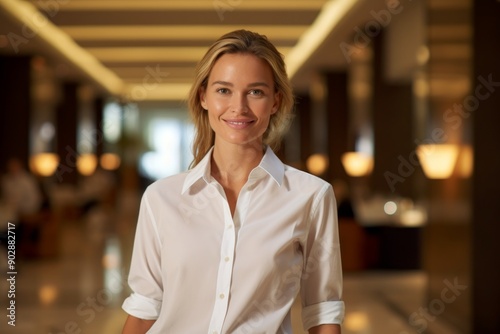 Portrait of a merry woman in her 30s wearing a simple cotton shirt isolated on luxurious hotel lobby