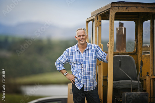 Portrait of a middle aged farmer standing by a mechanical digger.