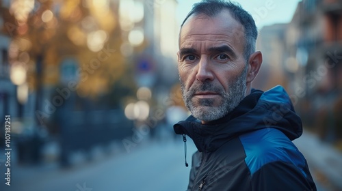 Portrait Of a middle-aged man with a serious expression standing On a city street.
