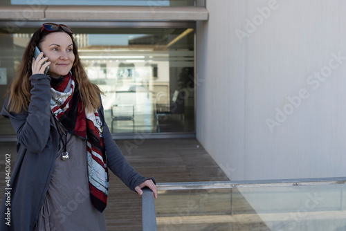 portrait of a middle-aged woman talking on the phone, outside an office building