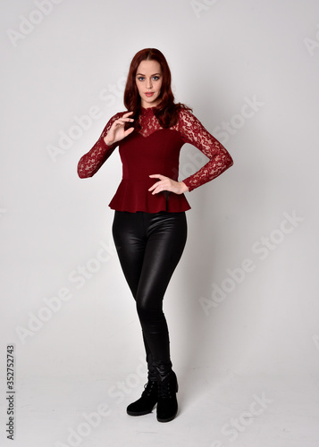 Portrait of a pretty girl with red hair wearing leather pants and long sleeved lace shirt. full length standing pose, isolated against a studio background.