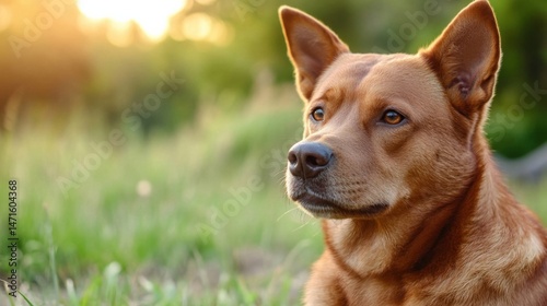 Portrait of a reddish-brown dog sitting in a grassy field at sunset, gazing thoughtfully into the distance, bathed in warm golden light. : Generative AI