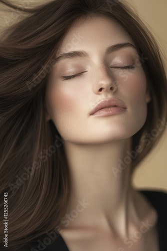 Portrait of a serene woman with flowing hair, showcasing natural beauty and skincare. Focus on relaxation, elegance, and wellness in a minimalist setting.