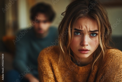 Portrait of a serious young woman frowning while a blurred man sits behind her