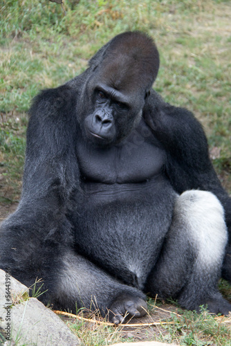 Portrait of a silverback gorilla sitting on the grass