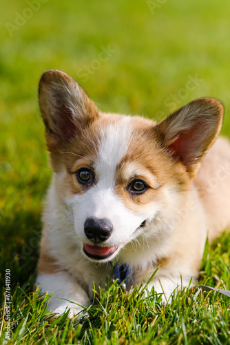 Portrait of a small Pembroke Welsh Corgi puppy on the green grass on a sunny day. Smiles and looks at the camera. Cheerful, mischievous dog. Care concept, animal life, health, exhibitions, dog breeds