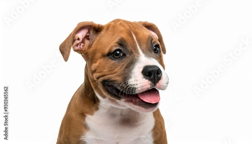 笑顔のアメリカン・スタッフォードシャー・テリアの子犬のポートレート(Portrait of a smiling American Staffordshire Terrier puppy on white background)