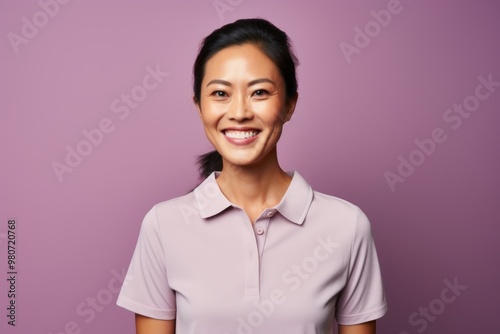 Portrait of a smiling asian woman in her 30s wearing a sporty polo shirt in front of soft purple background