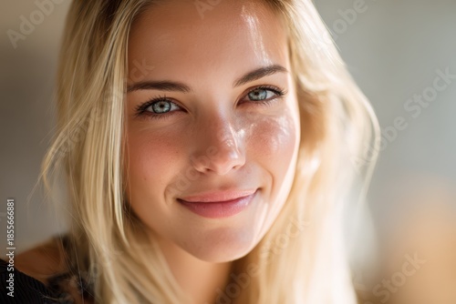 Portrait of a smiling blonde woman with glowing skin and bright white teeth in soft natural light